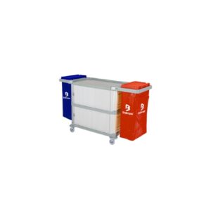 Os carrinhos possuem vários compartimentos e espaços determinados para transportar equipamentos e acessórios utilizados no ambiente de trabalho pelos profissionais de limpeza.