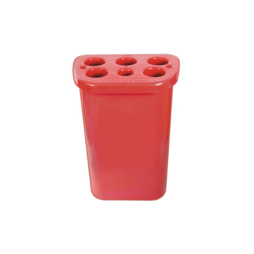 Lixeira de copos com 6 tubos para copos utilizados de água e café. Injetados em plástico polipropileno (PP), possui tubo interno extrusado em plástico poliestireno (PSAI) para copos de água (180/200mL), 1 (um) para copos de café (50mL) e 2 (dois) para descarte de palhetas usadas. Organiza e compacta os copos reduzindo o volume final do lixo.